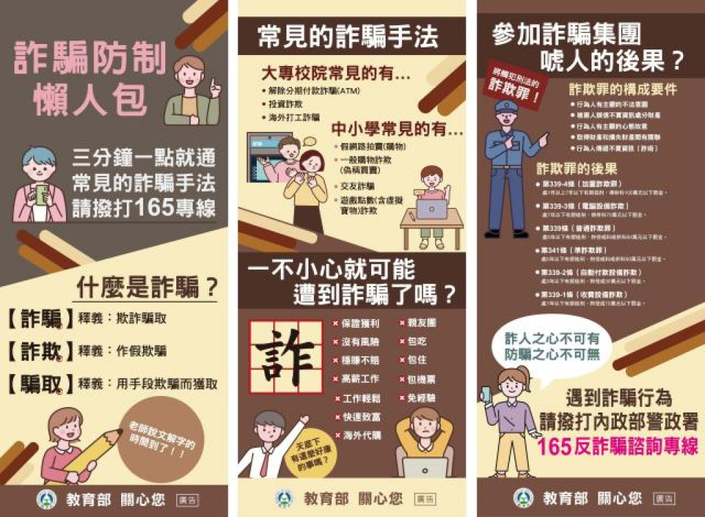 三、 | 本案懶人包電子檔亦可於「教育部詐騙防制專區」下載運用(https://reurl.cc/A3Wyye;路徑如下:宣導素材/各式文宣/「詐騙車手下場超慘,千萬不要以身試法!」宣導懶人包)。 |