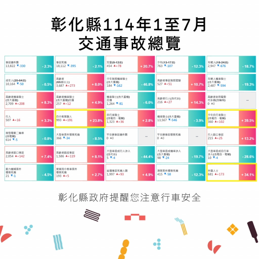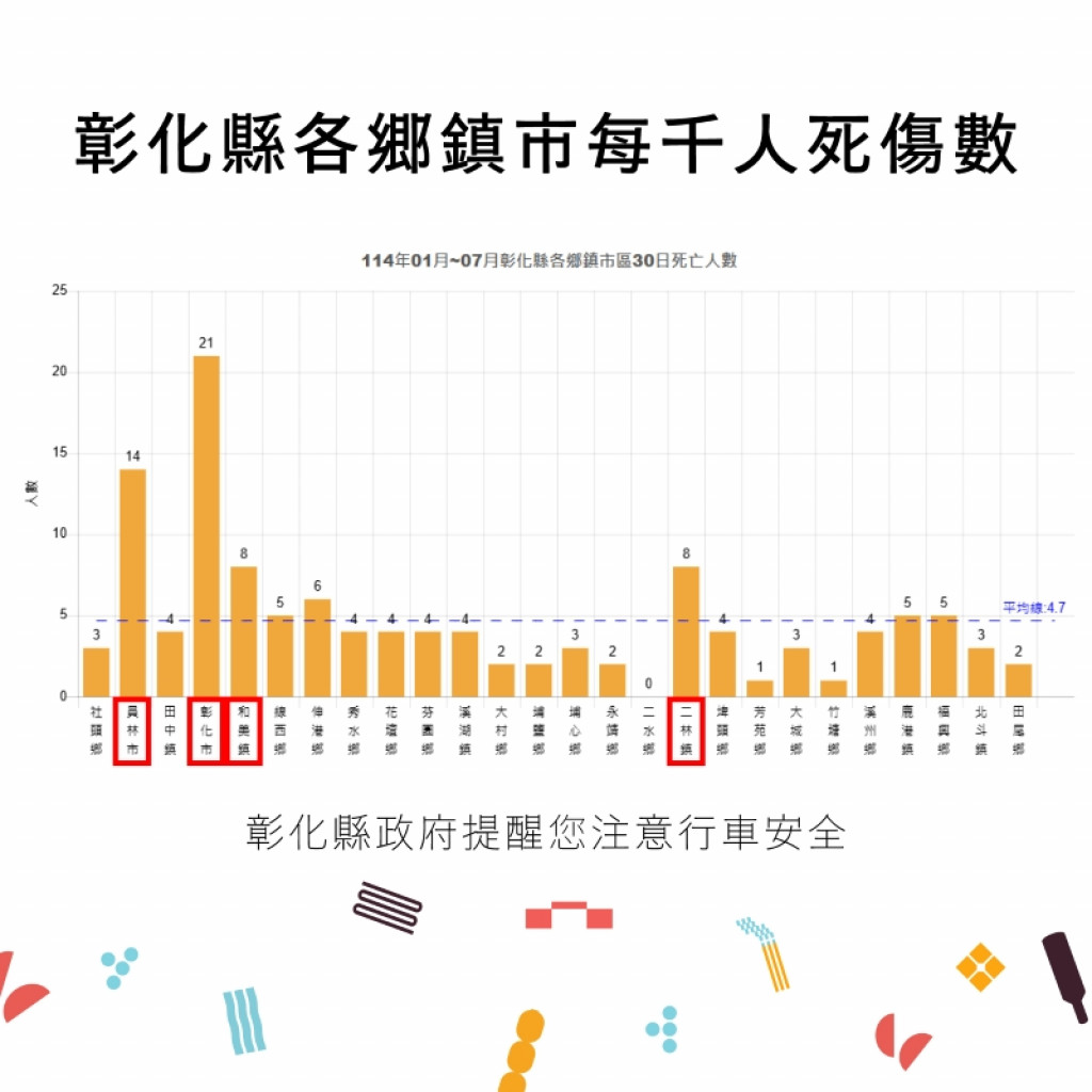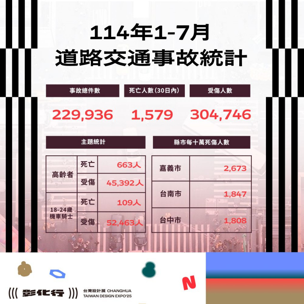 (四)附件為「114年1-7月全國道路交通事故統計、彰化縣交通事故總覽、本縣各鄉鎮市每千人死傷人數及肇事熱點」共4份統計資料宣導圖,社群宣導內容可參閱或分享本處「花現彰化-2025台灣設計展」(https://www.facebook.com/chcginformation)臉書粉絲專頁。