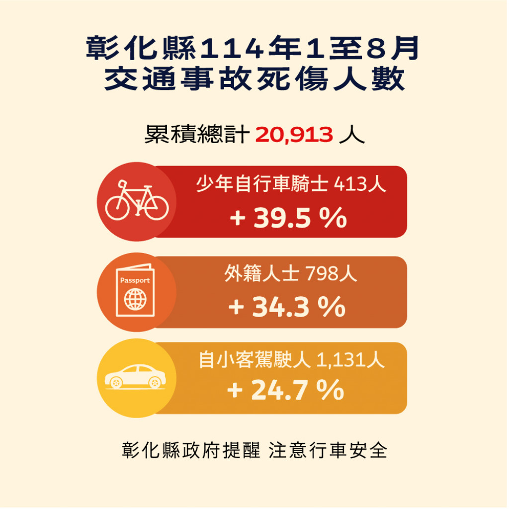 (四)附件為「114年1-8月全國道路交通事故統計、彰化縣交通事故死傷人數增加排行、本縣各鄉鎮市30日死亡人數、肇事熱點及交通事故肇因統計」共5份統計資料宣導圖,可參閱本處「花現彰化-彰化縣政府新聞處」(https://reurl.cc/8boQ0M)臉書粉絲專頁,相關宣導圖片素材請參閱:https://reurl.cc/DbyGR5。